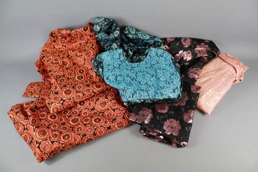 A Collection of 1960's  Evening Frocks. The frocks include a long sleeve, full length size 8/10 navy blue patterned viscose with lace bodice (1), a long sleeve, full length size 8/10 turquoise brocade (2), a sleeveless, full length, size 8/10 black and pink brocade frock with pearl decoration (3), a gold and pink brocade sleeveless, short, size 8/10 (4) and lastly, an orange and black brocade, full length, size 8/10 with long leg o' mutton type sleeves. (5)
