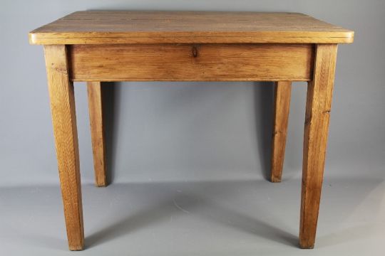A Small Pine Kitchen Table. The table with a single drawer to one side, raised on tapered legs, approx 90 l x 60 w x 75 h cms. (perfect to paint)