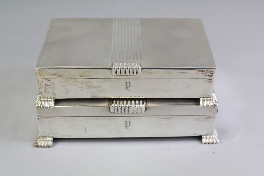 A Pair of Silver Cigarette Boxes. The first a desk top cigarette box approx  15 x 9 x 3.5 cms, initial 'P' engraved to front, mm CSG & Co, Birmingham hallmark, dated 1954  the other a table top cigarette box approx 16 x 11 x 4 cms, initial 'P' engraved to front, mm Charles Green & Co dated 1954, approx 870 gms together with a silver plated Ronson table lighter. (3)