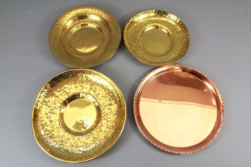 A Quantity of Middle Eastern Hammered Brass Charges. This lot includes three charges/plates together with a copper tray. (4)