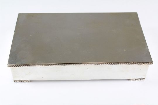 A Swedish Silver Double Cigarette Box. The box bearing the Swedish Three Crown national hallmark, dated 1955, retailed by W.A Bolin Stockholm, approx 21 x 12 x 5 cms, approx 1006 gms. The box engraved to the inside lid in Cyrillic.Note: W A Bolin are the oldest family firm of jewelers in Stockholm who have provided jewellery and fine objects to five Russian Tsars and three Swedish Kings.