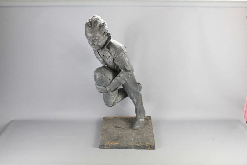 Graham Ibbeson (British 1951-    ) Bronze and Resin Scale Model. The scale model  based on the full-size statue of William Webb Ellis as seen outside Rugby School, modelled on the sculptor's son, approx 107 cms h.Note: Purchased directly from Graham Ibbeson and is the only known example, the sculptor is renowned for his sculptures and examples include Eric Morcambe, Benny Hill, Laurel & Hardy and Cary Grant amongst his works. (af)