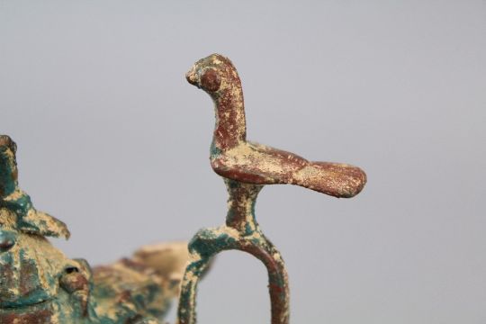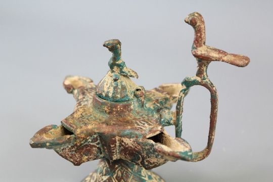 Antiquity - Persian Oil Lamp. The bronze lamp of multi-spout design supported on a spreading foot, hinged cover with bird finial and a looped handle with bird finial. The oil lamp benefits from incised decoration, approx 15 cms.Note: Property of a lady, formerly from Isfahan Iran.