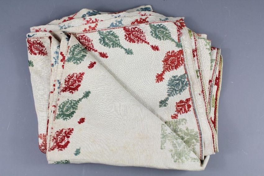 An 18th Century Dodecanese (Greek) Linen Embroidered Bed Curtain. The panel embroidered in silk with coffee pot motif and foliate decoration to the outside border, with a central leaf vine design , approx  254 cms x 106 cms ( showing some signs of wear)