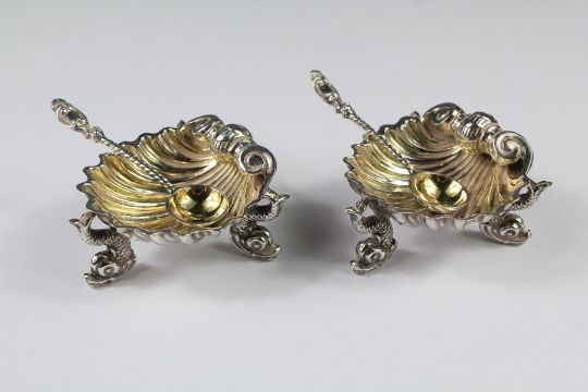 A Pair of Victorian Silver Salts. The salts modelled as scallop shells on dolphin feet, with matching salt spoons, approx 6 x 6 x 3.5 cms, London hallmark dated 1883, mm NG, approx 86.5 gms.