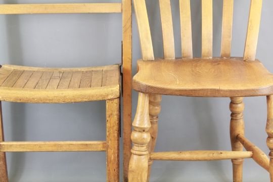 Six Vintage Pine Kitchen Chairs. The matching chairs having turned legs and stretchers, together with two vintage school chairs, approx 36 x 78 cms (2).