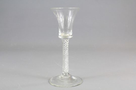 A Fine Georgian Ribbon Stem Wine Glass. The glass approx 16.5 cms h with rough pontil mark to base.