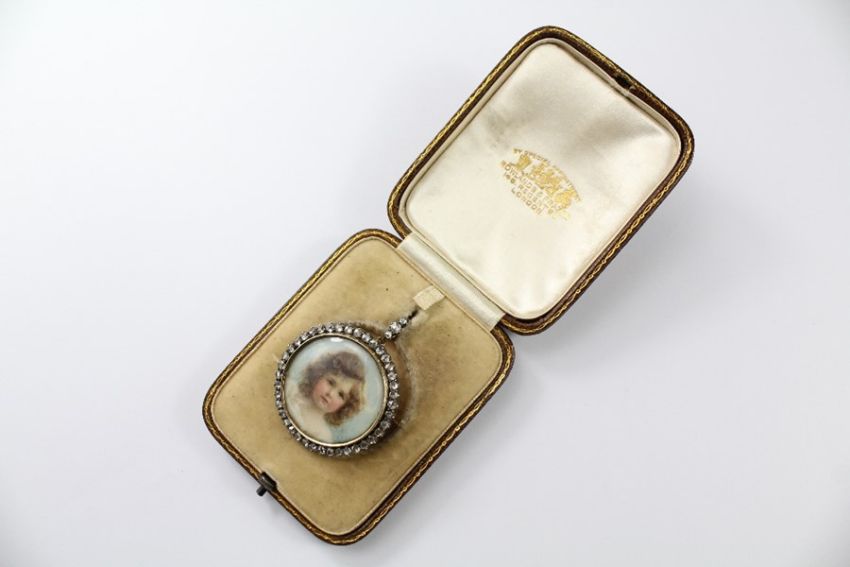 A 19th Century Fine 14/15ct Gold and Diamond Portrait Miniature Brooch/Pendant. The circular miniature depicts a little auburn-haired girl, framed by forty rose-cut diamonds of approx 2.2mm / 2pts each, total 80pts dias, monogrammed F.L.C, in the original Rowlands & Frazier velvet lined box, approx 35mm x 35mm.