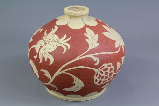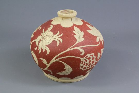 Castleford Potteries Ceramic Pot. The ovoid shaped pot having a terracotta ground with cream 'poppy' design, approx 19 x 16 cms, inscribed N. Vickers, dated 1951.