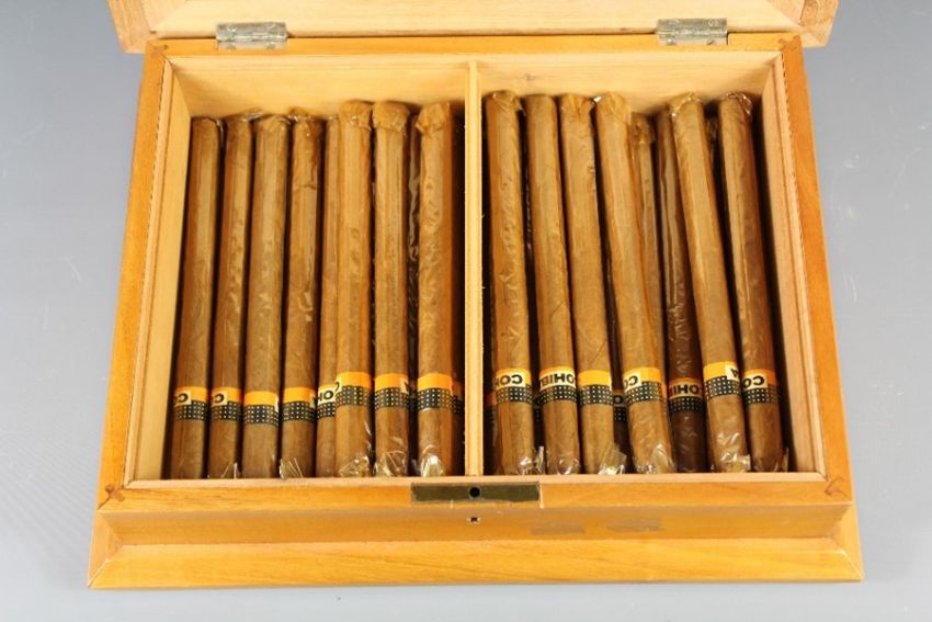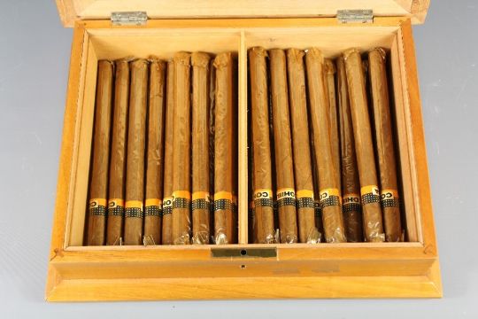 A Hand Crafted Box containing Cuban Cohibra Cigars. The presentation box with decorative inlay approx 34 x 26 x 8 cms contains approx 25 sealed Cohibra cigars.