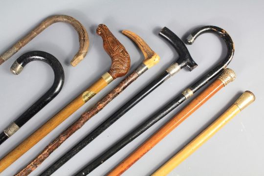 Vintage Walking Sticks. This lot includes a walking stick with a horse-head handle, two ebonised silver collared walking sticks together with five more.  (8)
