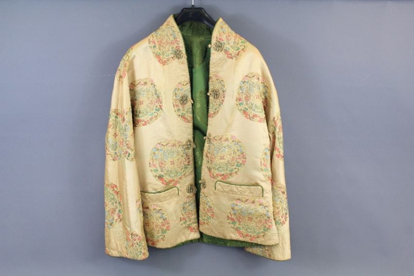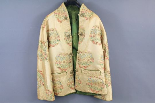 A Chinese Vintage Silk Jacket. The jacket is reversible and one side is in patterned ivory silk; detail to collar, front and cuffs, unusual fastenings, and the reverse a emerald green, size 10/12. (af)