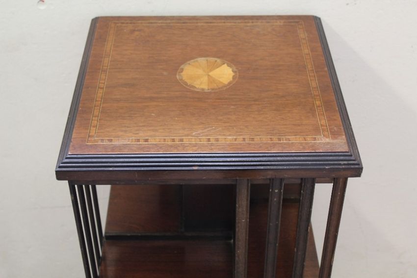 Revolving Bookcase. The one-shelf bookcase is inlaid with a central scallop motiff to top, approx 45 x 45 x 85 cms. (af)