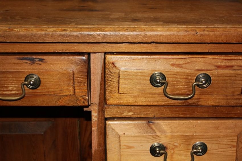 A Vintage Pine Desk. The desk with four short drawers to either side with a middle drawer with a cupboard beneath, approx 120 x 160 x 77 cms.