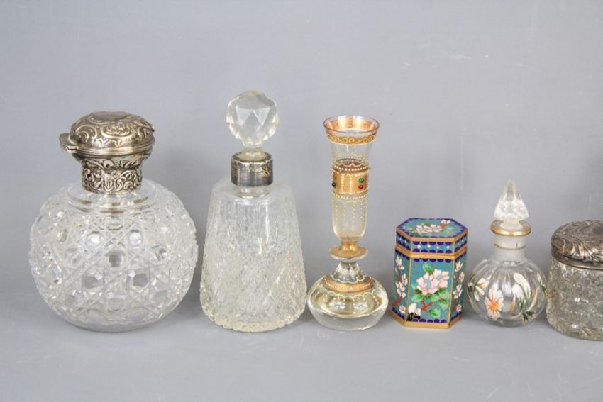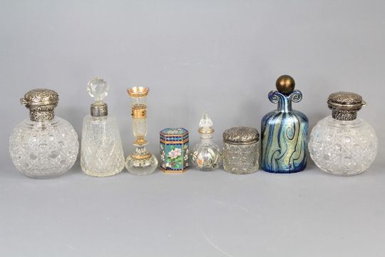A Pair of Cut-Glass and Silver Scent Bottles. This lot includes one other glass scent bottle and a cut-glass jar, Isle of Wight scent bottle, miniature vase, scent bottle and a cloisonne jar and cover (8)