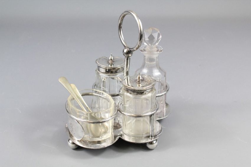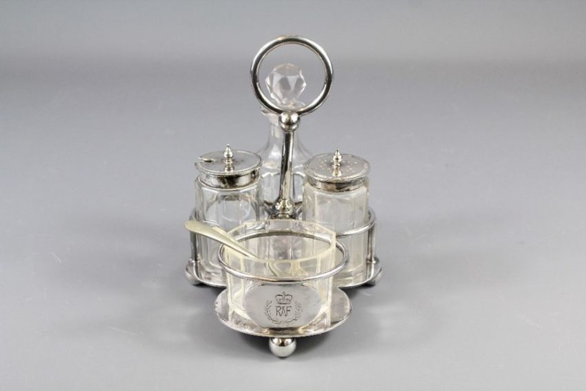 A Cut Glass and Silver Plated Cruet Set. The set comprising vinegar, salt, pepper and mustard with a silver spoon, the cruet set bears the RAF Insignia.