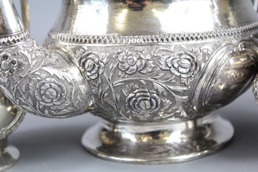 A Three Piece Indian Silver Tea Set. The set comprising tea pot, sugar bowl and milk jug. The set embossed with flowering vine, approx 1500 gms. (tested)