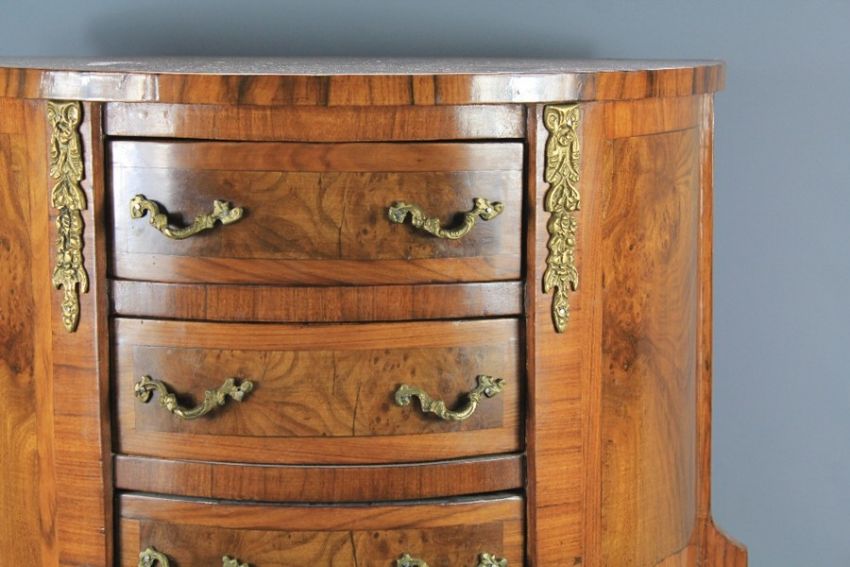 Louis XVI Style Walnut Demi-Lune Bedside Table. The table with three drawers and brass handles.