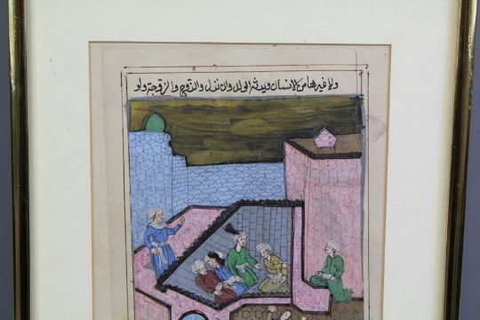 An Antique Persian Watercolour on Paper. The painting depicting the interior of a dwelling, with calligraphic naskhi script to the upper middle and lower middle, approx 19 x 14 cms, glazed and framed.