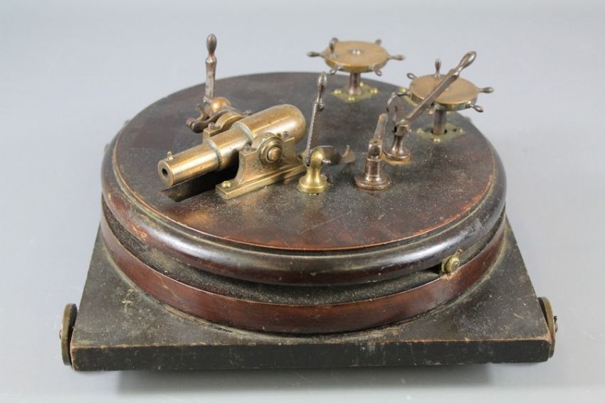 A Georgian Mahogany and Bronze Miniature Desk Cannon. The miniature cannon has working parts and has been known to fire, set on a circular rotational base, further raised on a square plinth with brass mounted wheels, approx 23 cms w. (needs some repair).