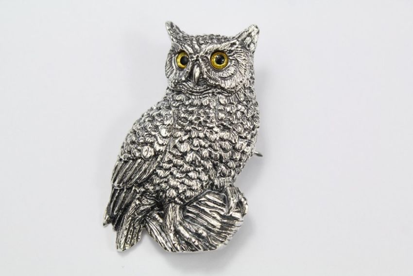 A Silver Owl Brooch. The owl having glass eyes, approx 45 mm, approx 11.5 gms.