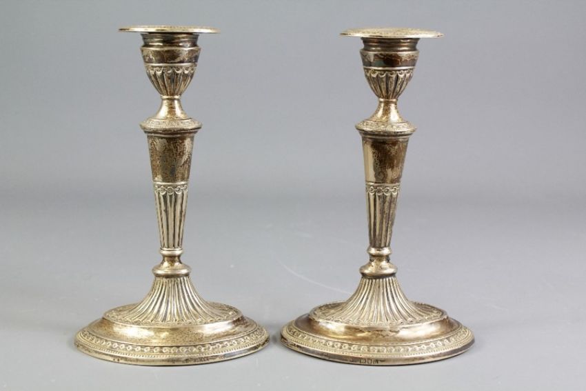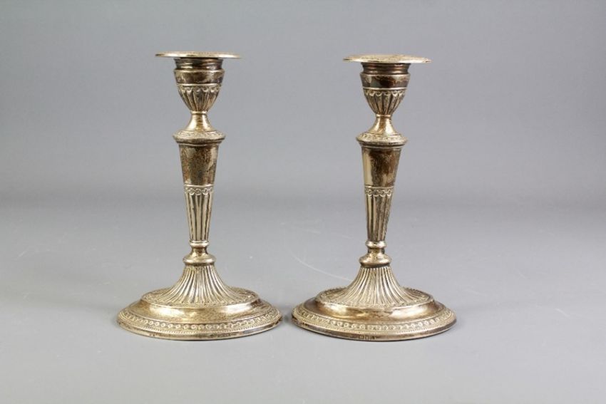 A Pair of Silver Regency-Style Candlesticks.The decorative candlesticks approx 19 cms h, London hallmark, dated 1900, mm TB, approx 20 cms, approx 748 gms.