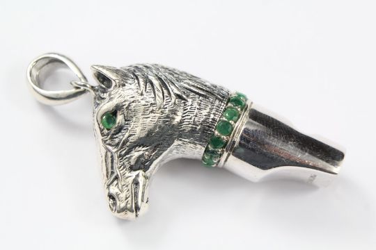 A Silver Horse Shaped Whistle. The horse having emerald collar and eyes, approx 17.6 gms, approx 40 mm.