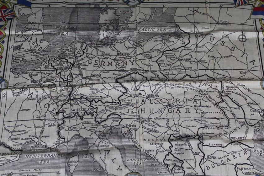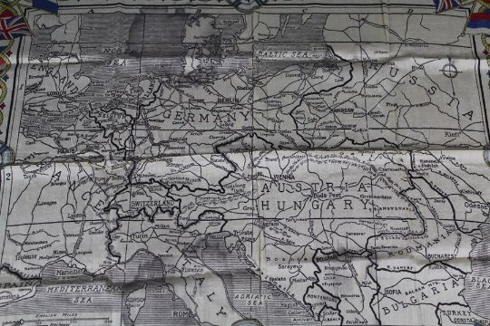 A Silk Souvenir Neck Scarf. The scarf depicting a European map surrounded by country flags, approx 61 x 40 cms.