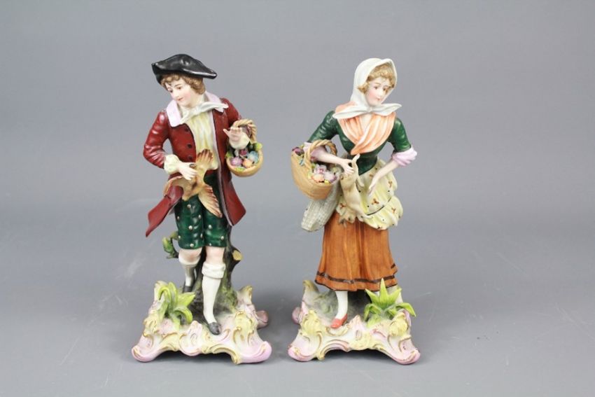 19th Century Sitzendorf Porcelain Figures. The figures depicting carrying baskets of flowers and game, heightened with gilt, approx 18 cms, factory marks to base.