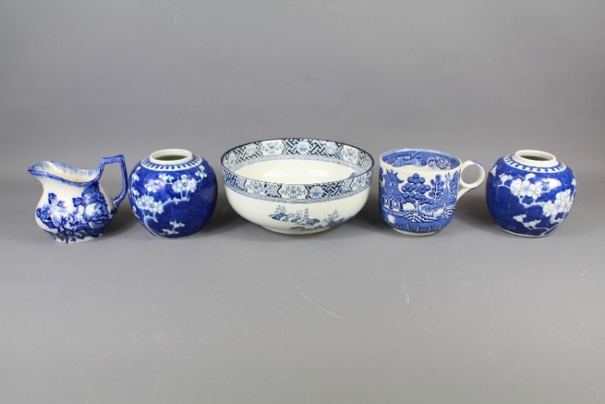 A Quantity of Blue and White Pottery. This Lot includes a Kang-Hi Wood & Sons bowl depicting Chinese scenes, approx 24 cms dia., a Doulton Burslem Willow Pattern Mug approx 11 cms h x 12 cms dia., an Ironstone Staffordshire jug approx 11 cms h x 13.5 cms dia., two ginger jars (no lids approx 13 cms wide x 13 cms h., and an Ironstone Staffordshire jardiniere depicting flowers with a fluted edge, approx 18 cms dia x 23 cms h wf. (6)