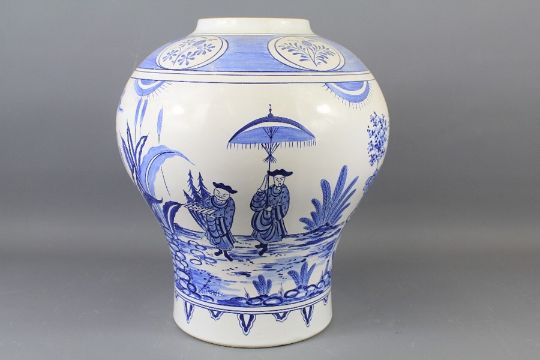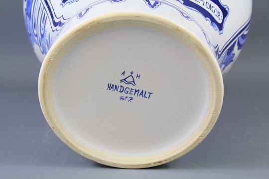 A Large Delft Ware Blue and White Chemist Jar. The jar labelled 'Opiferove per Orbem: Dicor' with a heraldic shield, approx 36 cms h, marked A H to the base.