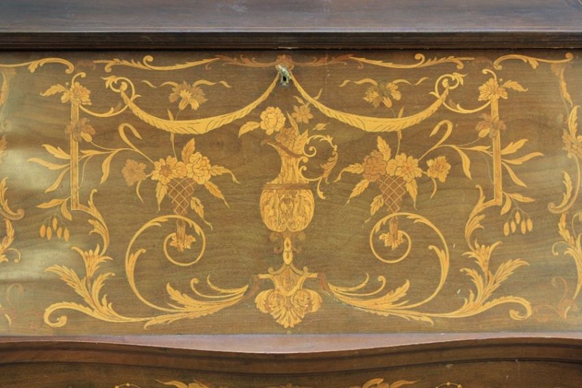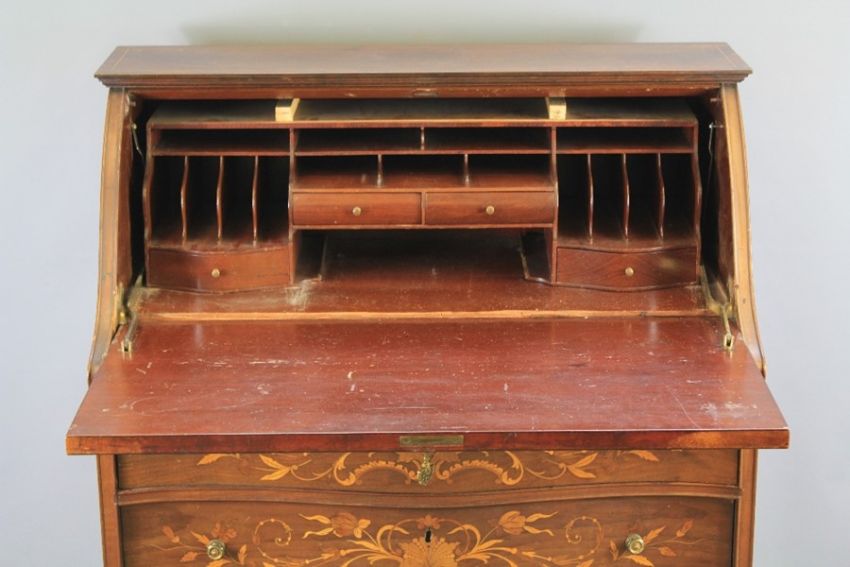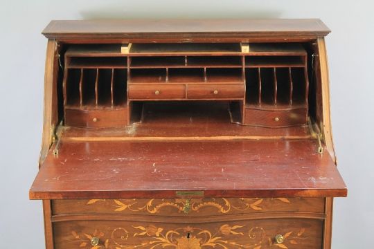 An Irish Inlaid Writing Desk. The desk with decorative foliate inlay belonged to Malcolm Fayerweather Gordon C.B.E D.Sc (1913-2005) of Gordon Aerolite fame. The desk measures approx  81 cm w x 105 h x 43 cms d. With serpentine drop-front writing slope, fitted interior with pigeon-holes and three drawers beneath, raised on cabriole legs together with his chair. His Order of Service is inside. (af)Note: This desk belonged to Malcolm Fayerweather Gordon C.B.E D.Sc. Gordon in association with Dr de Bruyne created a laminate of flax roving and paper soaked with liquid phenolic resin and cured under pressure and used on the tail fins of the Spitfire thus named Gordon Aerolite. This reinforcement was suggested by Mr Malcolm Gordon in response to a publication of Dr de Bruynes lecture to the Royal Aeronautical Society in 1937, Gordon's family had connections to a Belfast linen business which supplied Dr de Bruyne with flax.