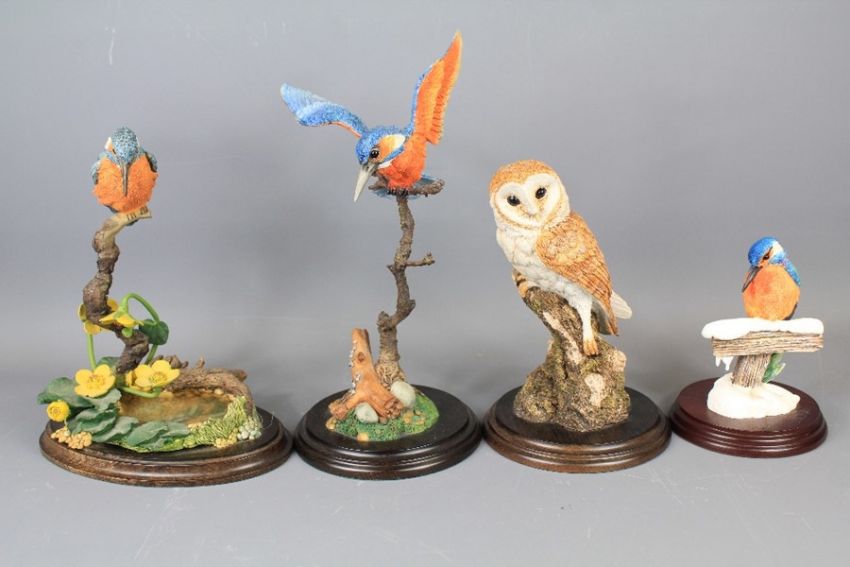 A Collection of Country Artists Bird Figurines. This Lot includes an 'Owl' approx 20 cms, 'Kingfisher with Marsh Marigold' numbered CA 355 approx 25 cms, 'Kingfisher on Branch' approx 29 cms and a Border Fine Arts B0024 'Kingfisher' approx 15 cms. (4)
