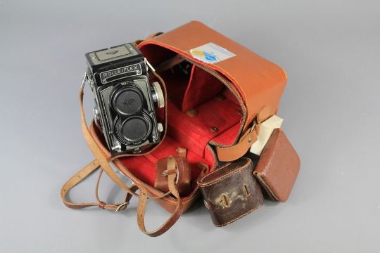 A Vintage Rolleiflex Model K8 T1 Syncro Compur Camera. The grey body camera appears to be in good cosmetic condition, complete with a Gossen colour finder, Rollei frames, filter kit code 129030-3 and lens hood all in the original leather carrying case, serial nr 2 113400.