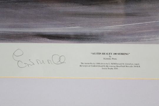 Nicholas Watts Motor Racing Limited Edition Lithograph. The print entitled 'Austin Healey 100, Sebring' numbered 93/500 signed in pencil to the mount, glazed and framed, approx 72 x 54 cms.
