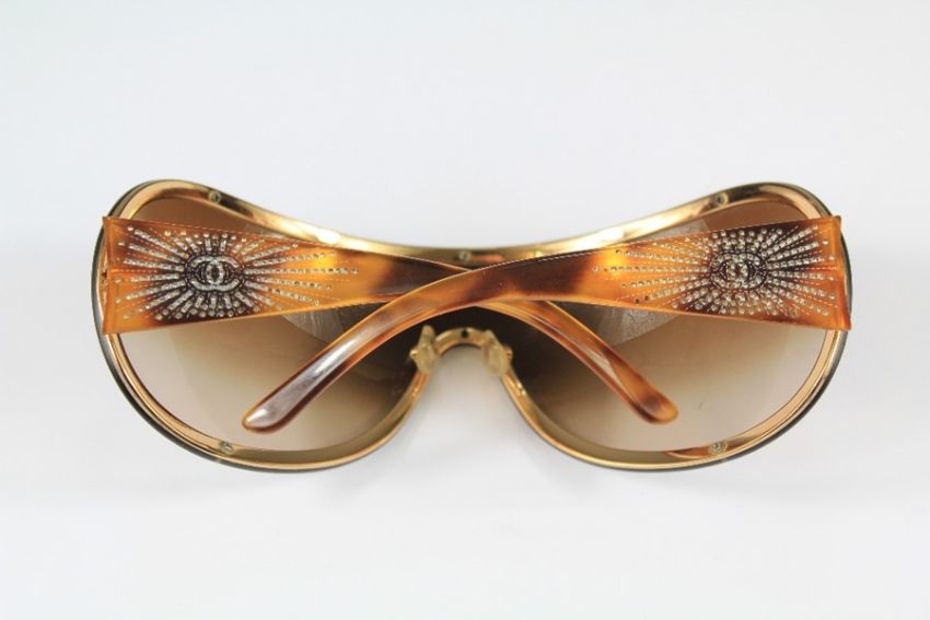 Vintage Chanel Sun Glasses. The glasses in tortoiseshell effect with sunburst design on the temple frame, nr 4148-B C.125/13 in the original black leather case.