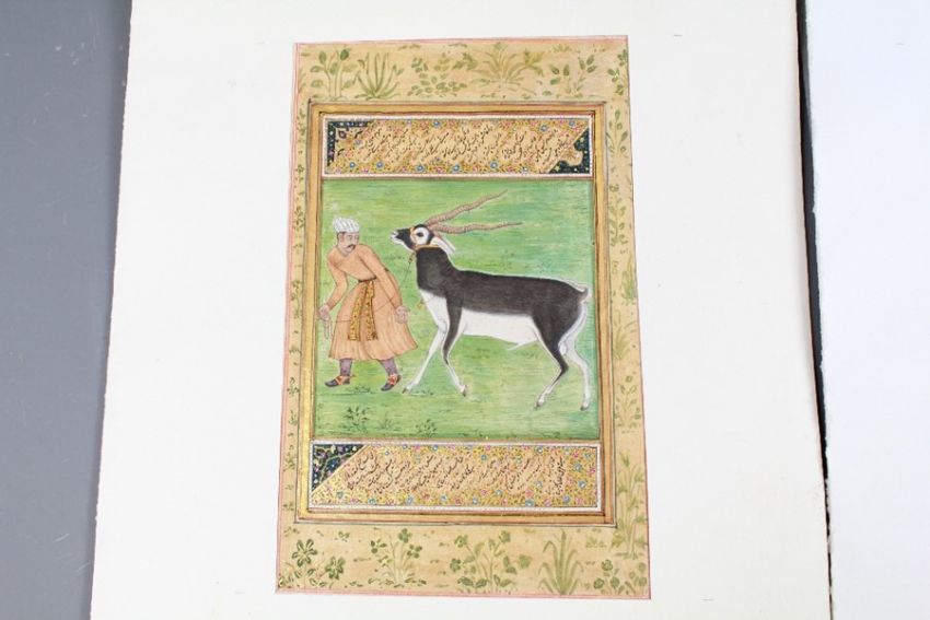 19th Century Persian Miniature Paintings. The painting depicting a man leading an Ibex, heightened with gold paint, approx 14 x 23 cms the other unfinished work depicting a caravan with musicians and a parrot, approx 16.5 x 22.5 cms. (2)