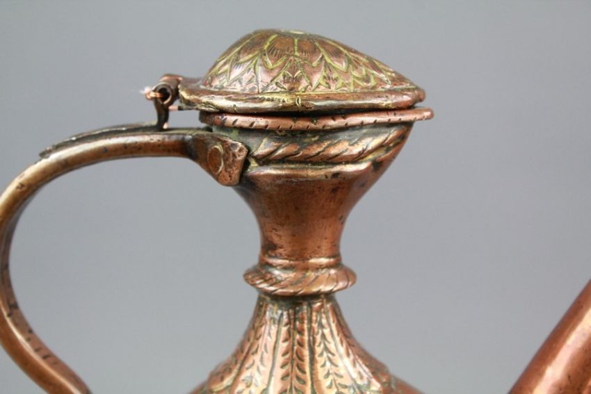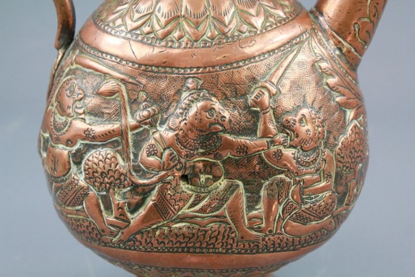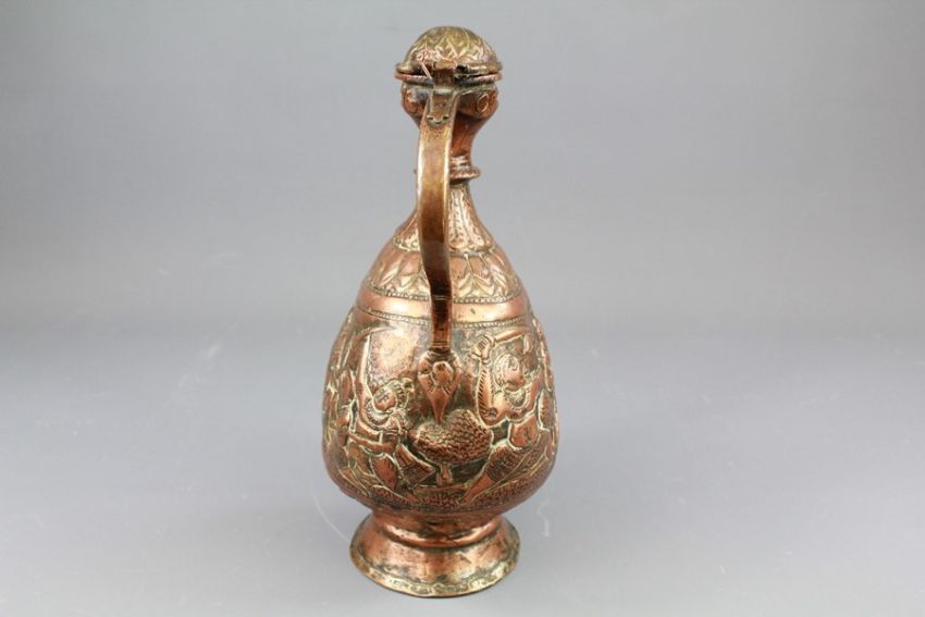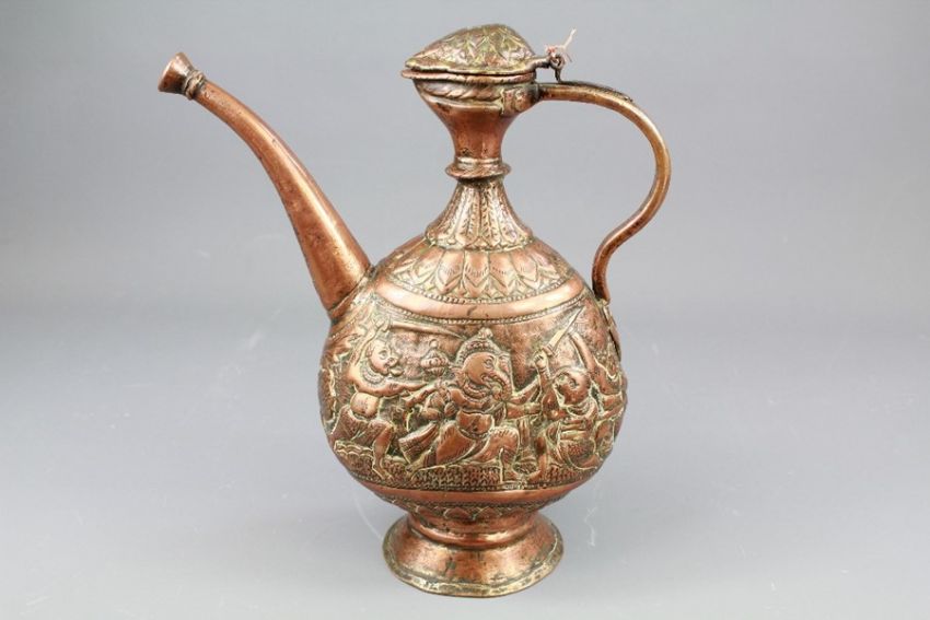 A 17th Century Indian Copper Ewer. The embossed body depicting scenes from Indian lore, hinged cover, approx 28 cms (af)