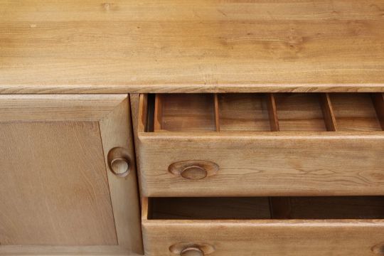 A Light Oak Ercol Sideboard, central drawers with fitted interior and cupboards to either side, approx 155 l x 33 d x 70 h cms.