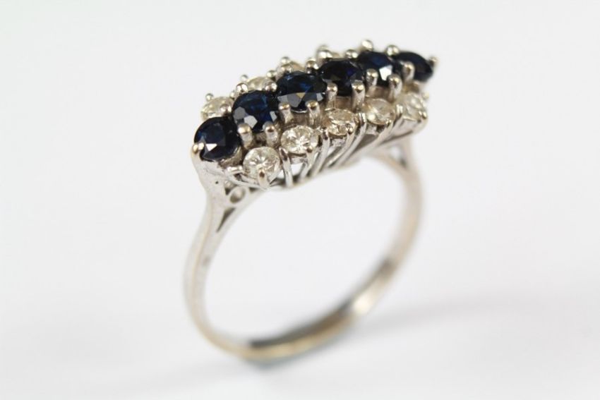 An 18ct White Gold Sapphire and Diamond Ring, approx 4.84 gms, size O, set with 6 x 3.25 sapphires and approx 16 pts dias.