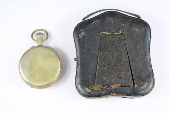 A Goliath Pocket Watch in Silver Case. The watch having a white enamel face with Roman dial, blued hands and a second aperture, housed in a silver green velvet lined travelling case, Birmingham hallmark, dated 1906 together with another Goliath pocket watch (af)