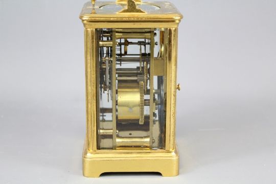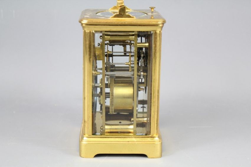 A 19th Century French Brass Carriage Clock. The clock having a bevelled glass panel enclosing a white enamel face with Roman numerals, approx 7 x 10 cms, repeating movement, striking on a gong, complete with key, approx 14 x 10 cms.