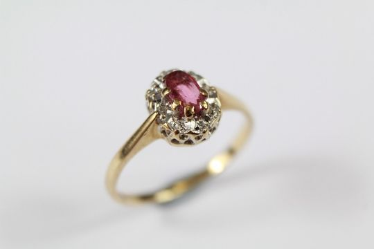 A 9ct Gold Diamond and Ruby Ring, size H, approx 1.44 gms, set with a 5 x 3 mm ruby and approx 6pts of 8-cut dias.