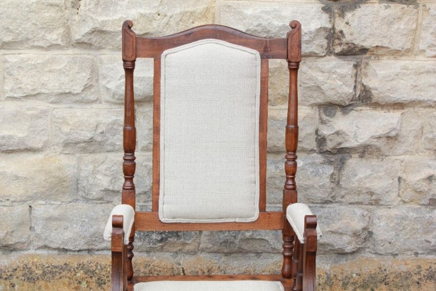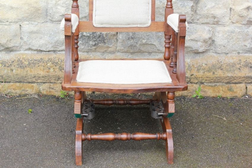 An American-style Rocking Chair. The chair having neutral-shade seat, back and arm rests, turned back support columns and sides and stretchers, approx 58 x 44 x 106 cms.