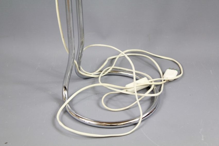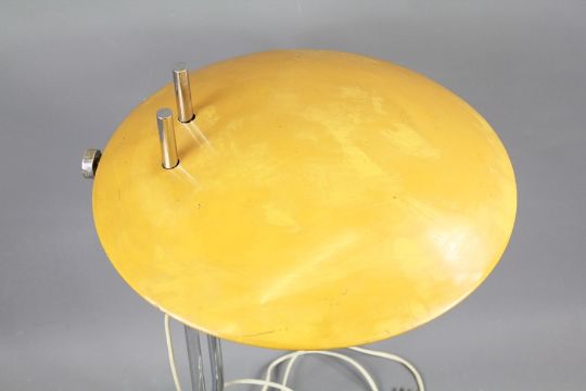 An Art Deco Chrome and Enamel Table Lamp. The lamp stand of simple design mounted with a large yellow enamel disc, approx 63 cms h.
