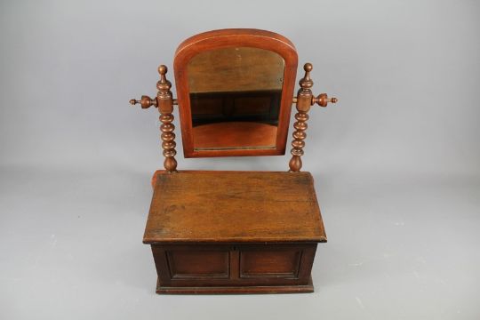An Apprentice Piece Mahogany Box, approx 35.5 x 21 x 18 cms h., together with a fruit wood vanity mirror. The mirror having 'bobbin' side support columns with decorative finials, the support measures approx 45 x 16.5 x 48 cms h.