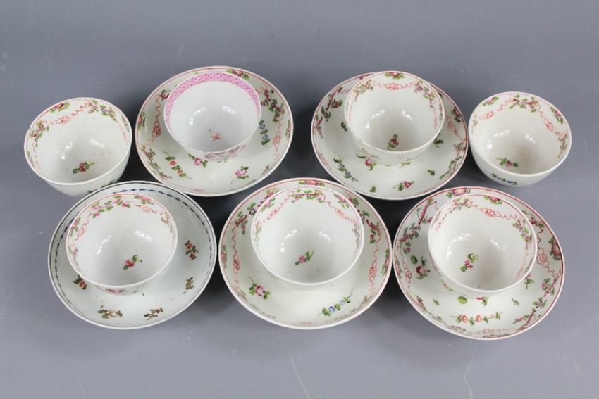 18th Century English Tea Bowls and Saucers. This lot includes six Newhall tea bowls and five saucers painted with the knitting wool design.