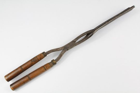 A Victorian Crimping Iron. The crimping iron with wood-turned handles.