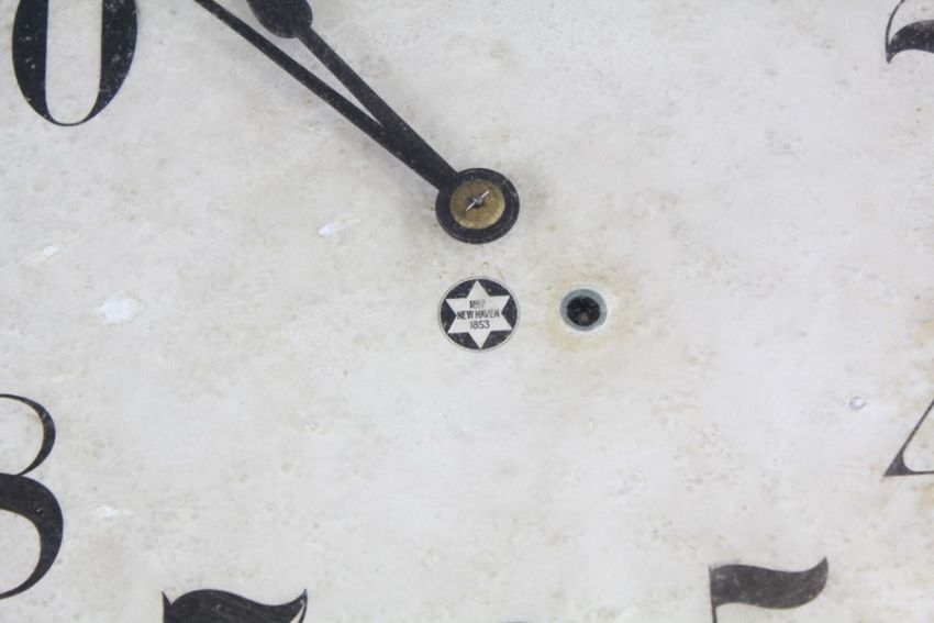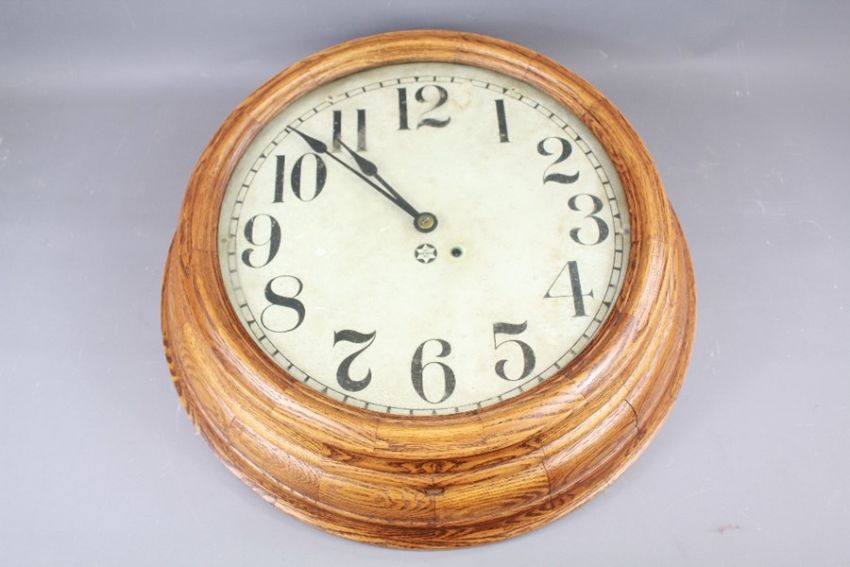 An Oak Frame Circular American Wall Clock. The clock having an enamel face with numeric dial, made by The New Haven Clock Company, New Haven, Conn., U.S.A., wooden frame, approx 55 cms dia. (af)