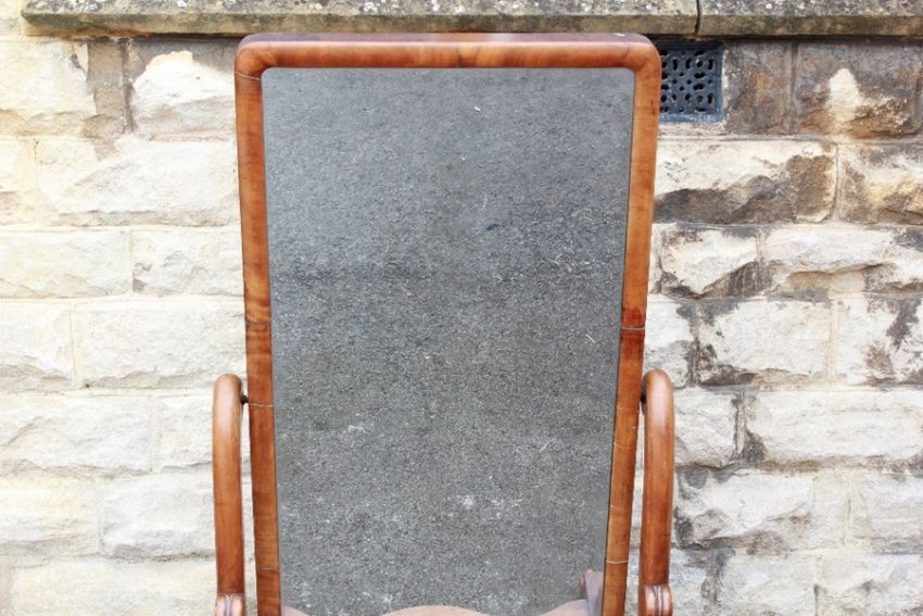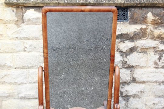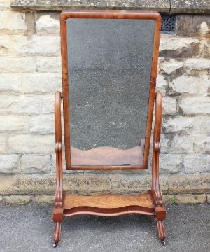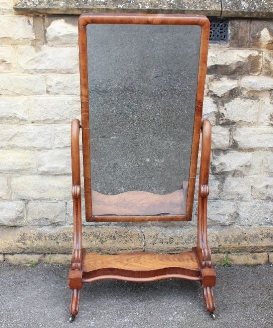 A Late Victorian Cheval Mirror. The bevelled mirror on sturdy stand with swept supports on porcelain casters, approx 82 x 162 cms, lower shaped shelf.